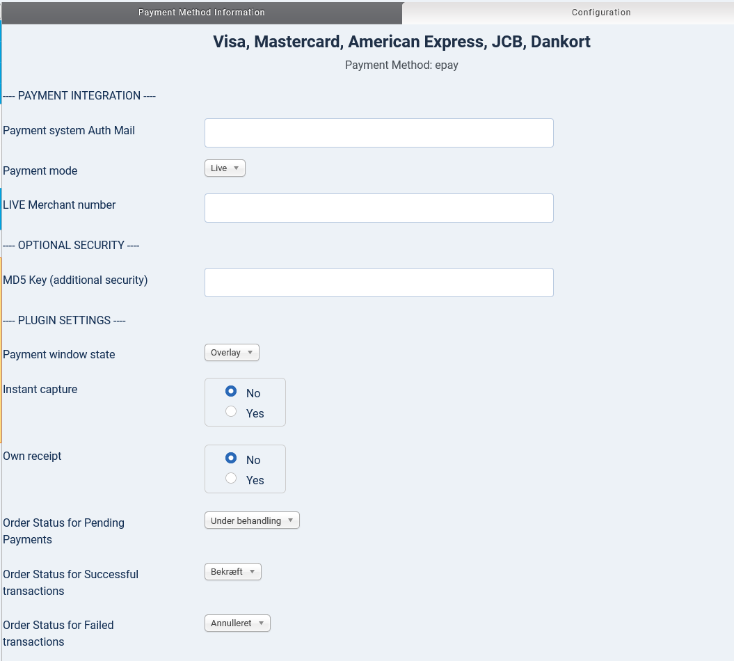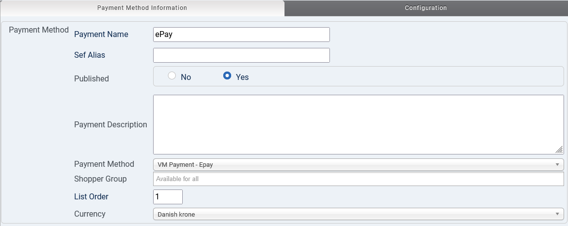 - This ePay payment plugin for VirtueMart can be configured. Please see pictures above for configuration options.