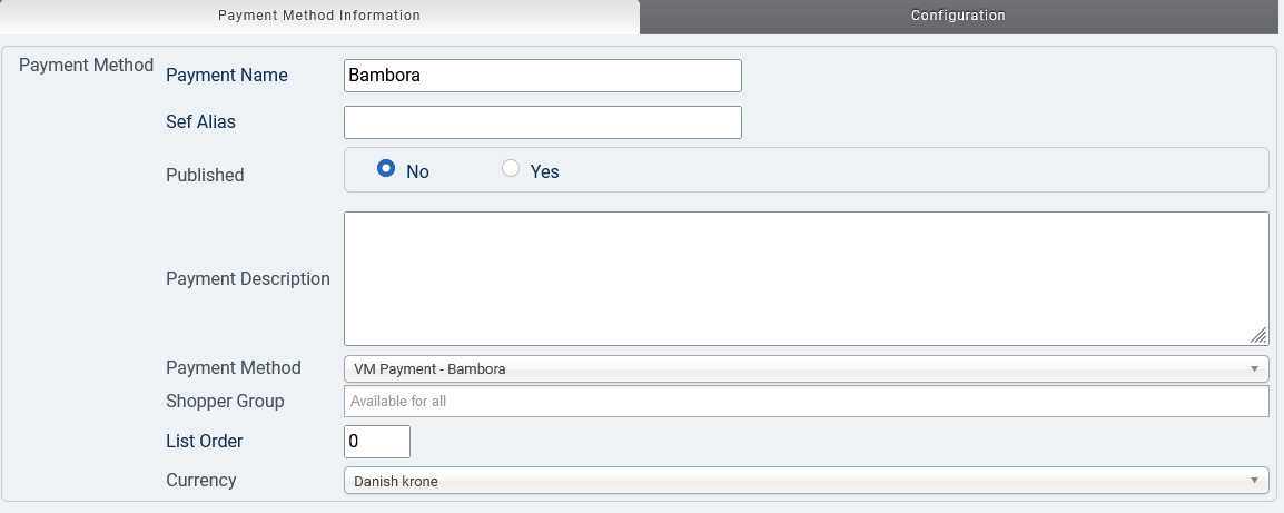 - In the second tab called "Configuration" you can now set the Merchant ID and more from your Bambora account and thus make the connection between the webshop and your Payment Service Provider (PSP).
